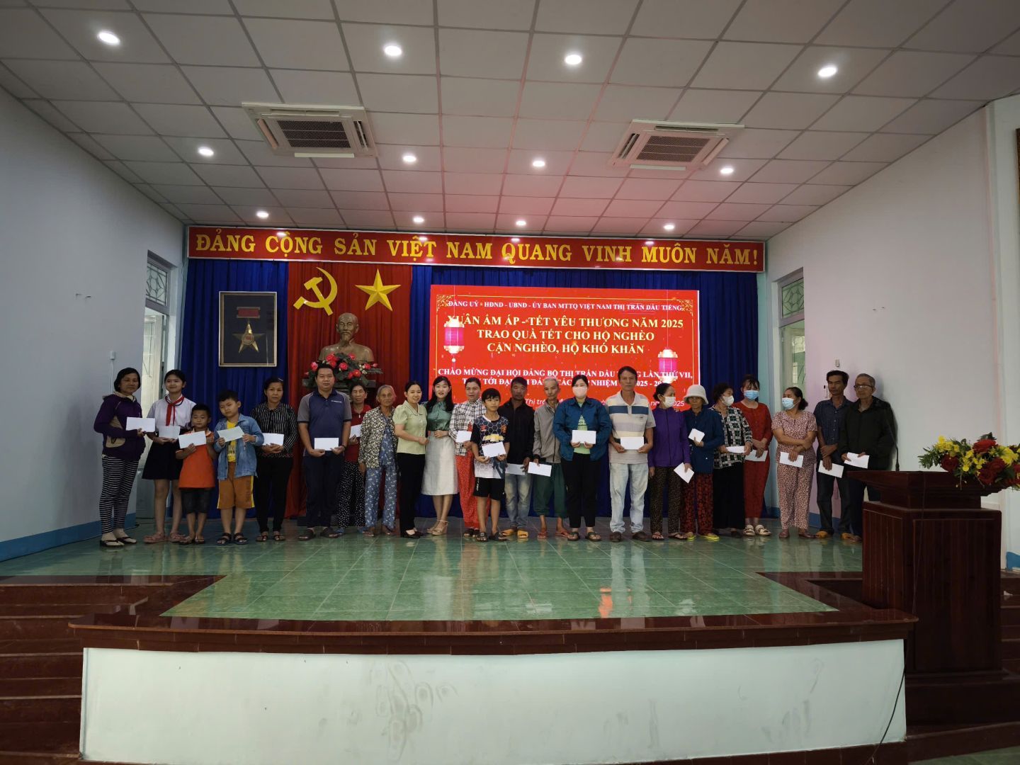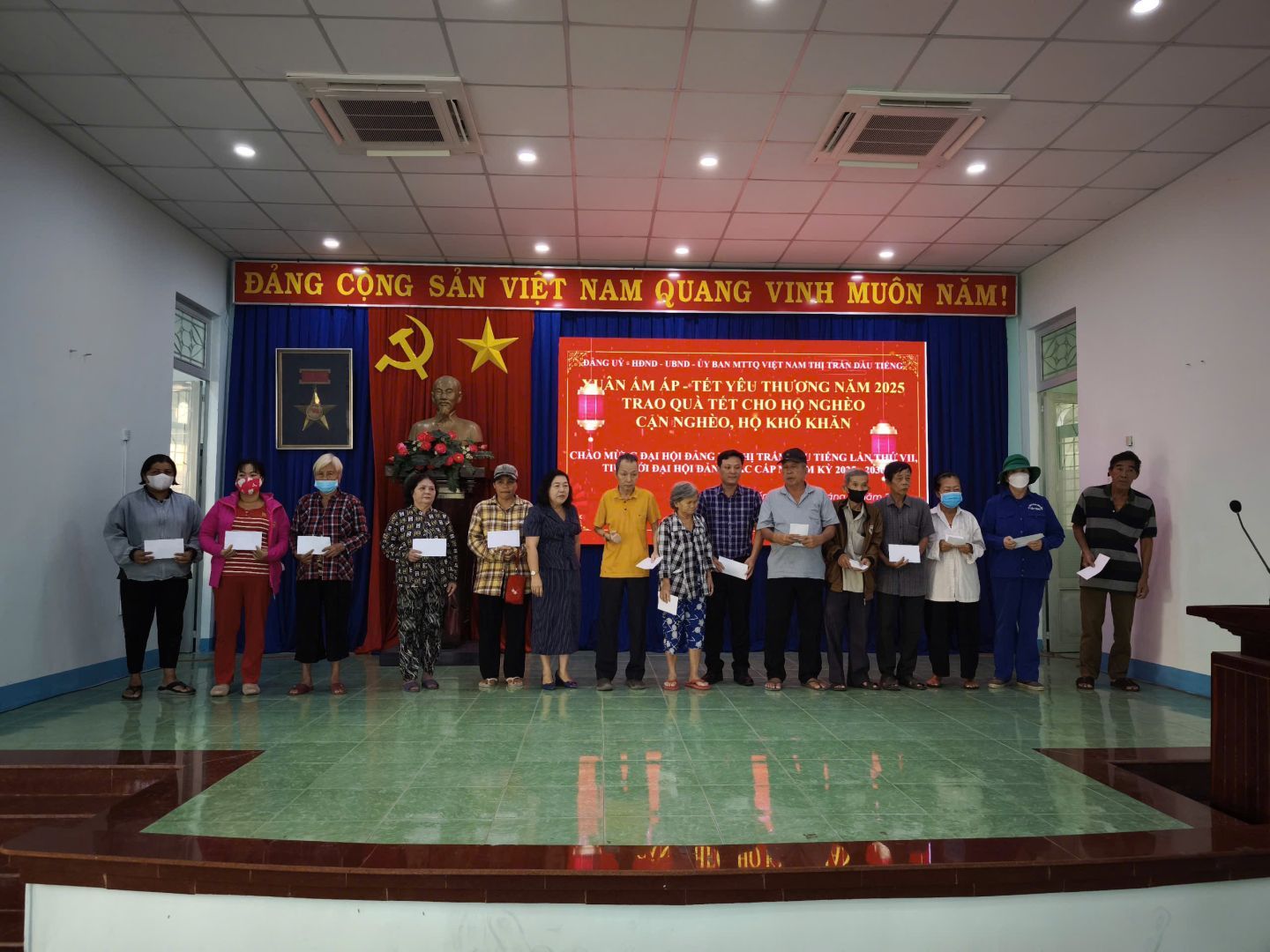 Với tinh thần tương thân, tương ái, nhân dịp Tết Ất Tỵ năm 2025, sáng ngày 17/01/2025 tại Hội trường UBND thị trấn Dầu Tiếng, Đảng ủy - HĐND - UBND - UBMTTQ Việt Nam thị trấn Dầu Tiếng tổ chức trao quà Tết cho bà con hộ nghèo, hộ khó khăn tại thị trấn Dầu Tiếng. Chương trình có sự tham dự của: Bà Vương Thị Thanh Lan - Phó Bí thư Thường trực Đảng ủy; ông Nguyễn Thành Dự - Phó Bí thư Đảng ủy - Chủ tịch UBND thị trấn; bà Phan Thị Kim Tiến – Phó Chủ tịch HĐND thị trấn; bà Nguyễn Thị Bích Châu - Chủ tịch Ủy ban MTTQ Việt Nam thị trấn cùng các ông bà trong Ban Thường trực; Ban công tác Mặt trận 8 khu phố và sự có mặt của 100 hộ gia đình được trao tặng quà.